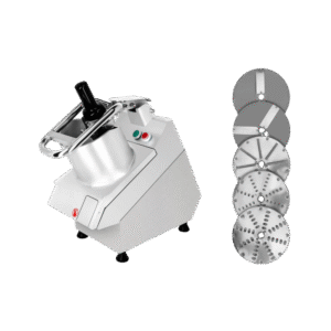 Coupe-légumes professionnel avec moteur puissant, 5 disques inclus et double tiroir. Idéal pour râper, trancher et préparer rapidement fruits et légumes en événement.